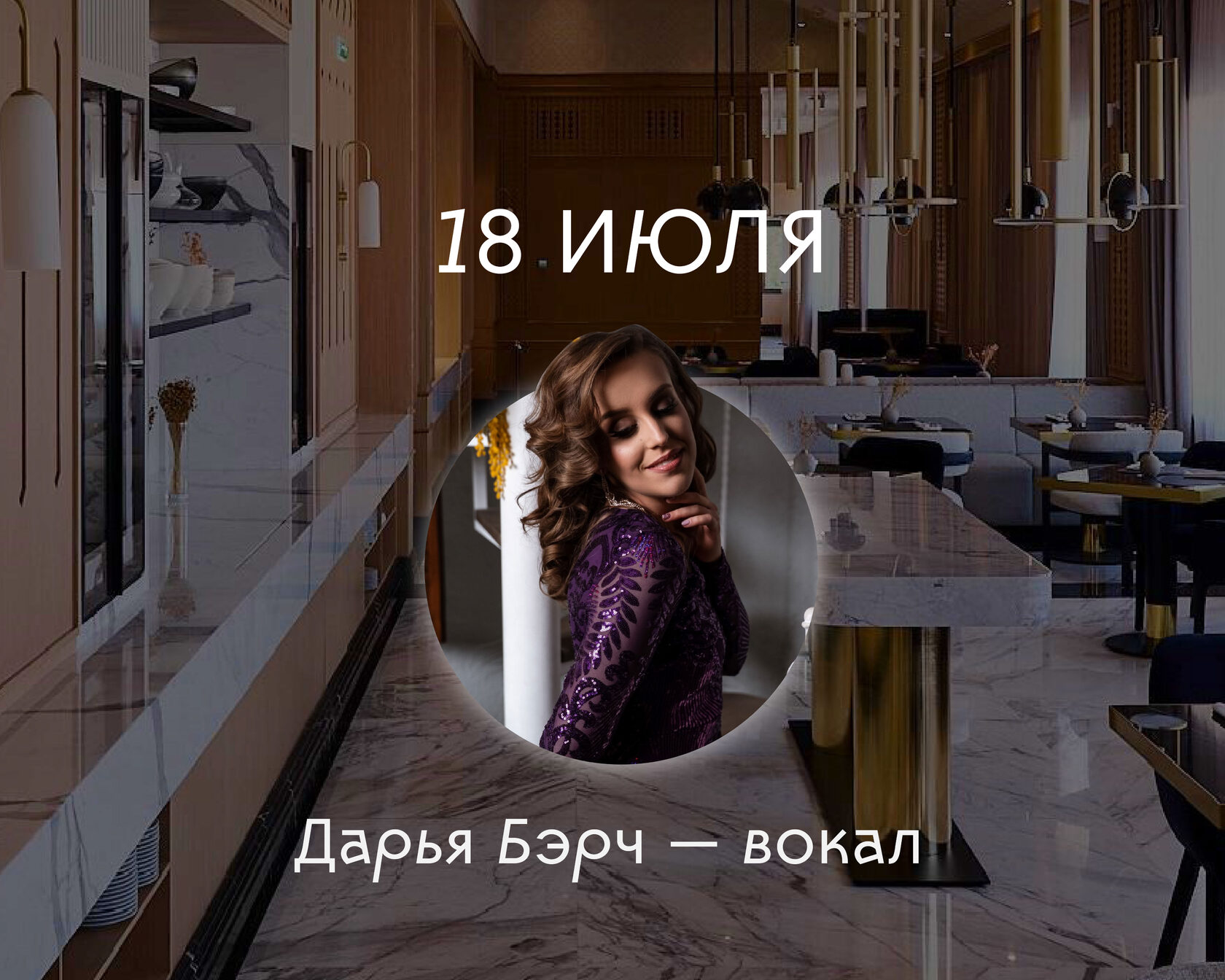 С 19:00 до 21:00 поёт Дарья Бэрч — джазовые мотивы, мягкий голос, атмосфера живого концерта в панорамном зале.