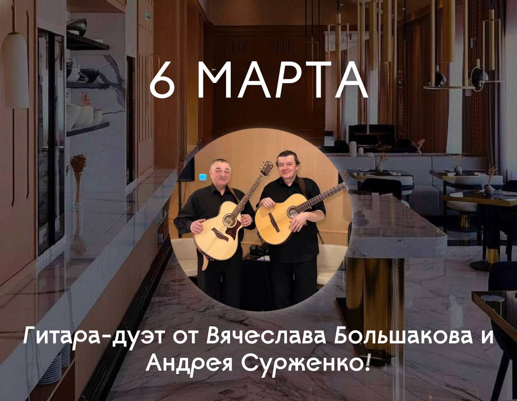 С 19:00 до 21:00 в панорамном зале звучит гитара-дуэт Вячеслава Большакова и Андрея Сурженко. Знакомые мелодии, живое исполнение и та самая атмосфера, в которой хочется остаться подольше.