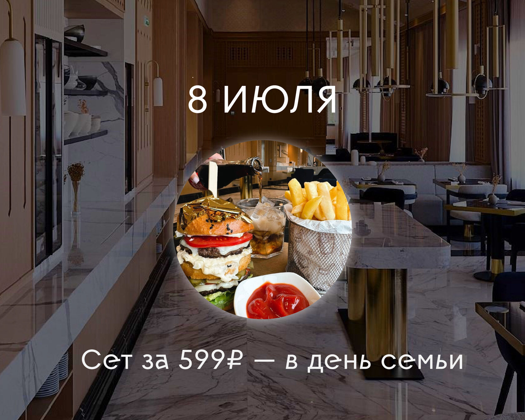 Специальное предложение для семейных гостей: сет «Семейный» за 599₽ — бургер, картофель фри и бокал колы.