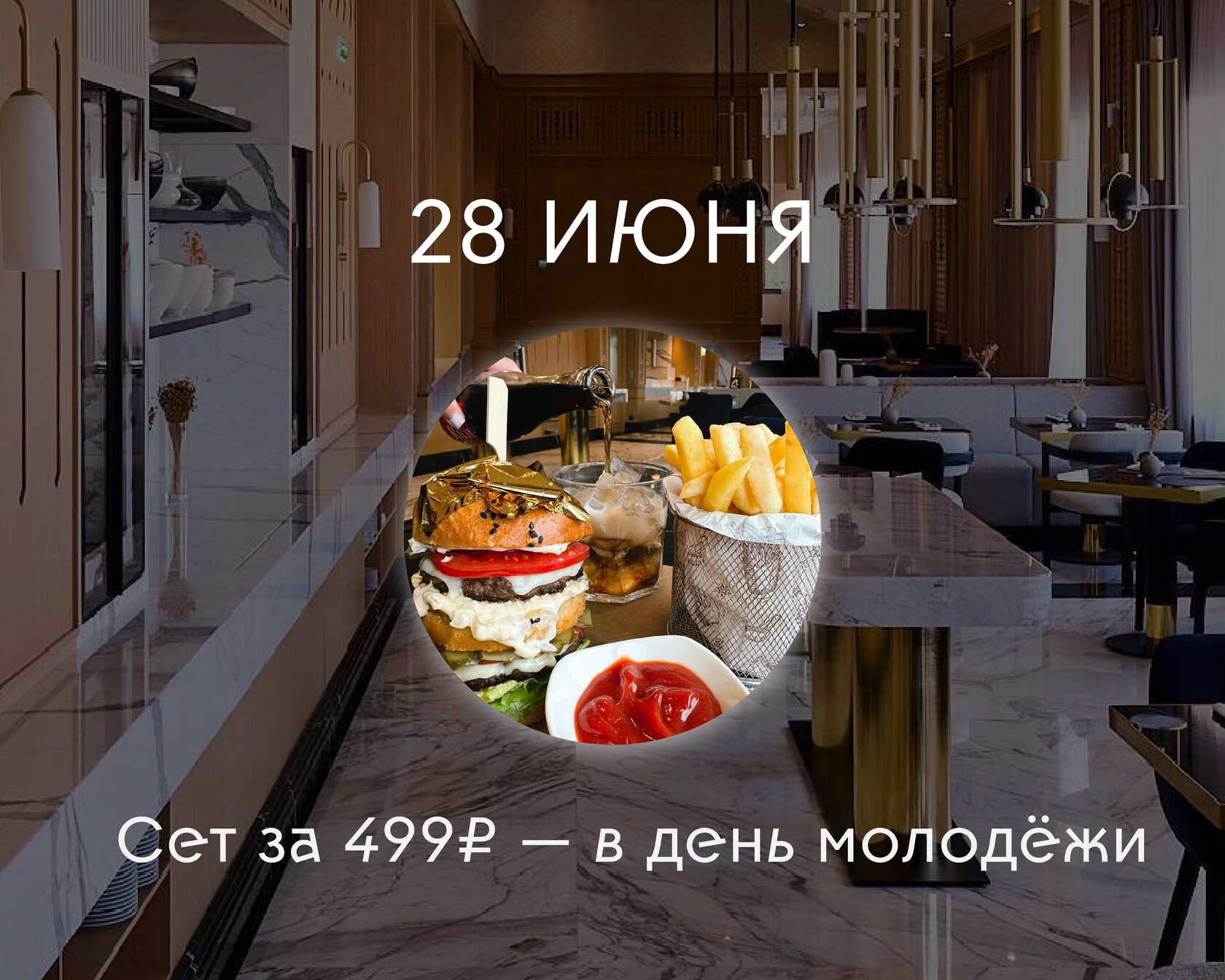 Сочный Бургер с сусальным золотом, картофель фри , кола – еда, когда хочется простого удовольствия со вкусом. И всё это за 499 ₽ только в эту субботу.